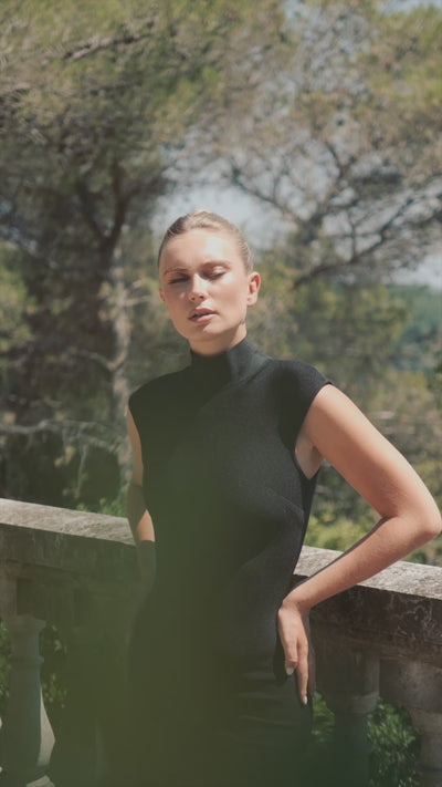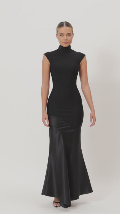Introducing the Genevieve Maxi Dress. Combining a fitted crepe knit bodice with a sleek turtle neckline and contrasting flowing satin skirt, the Genevieve Maxi Dress is the perfect balance of structure and softness for an effortlessly elegant look.