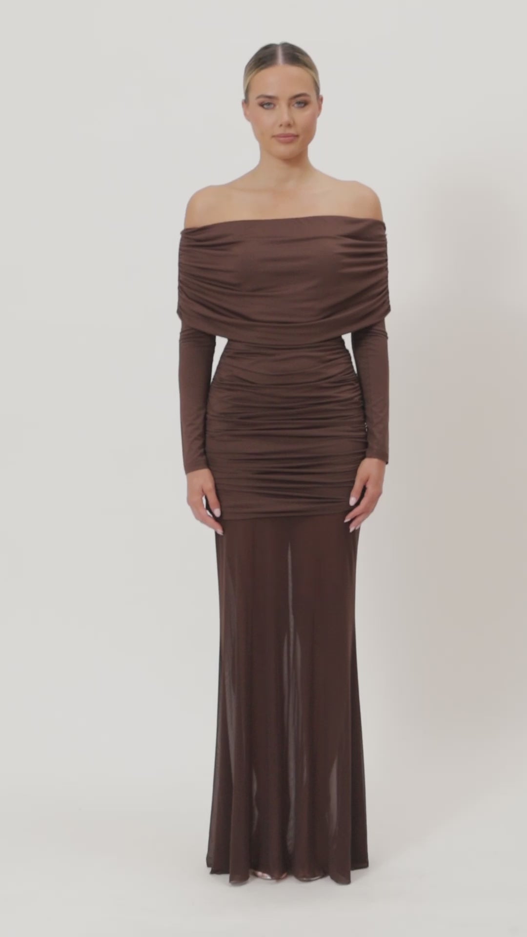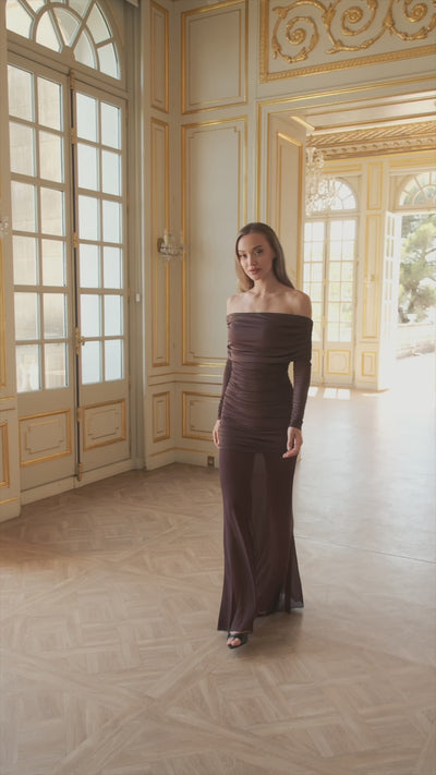Introducing the Jordana Maxi Dress. A captivating strapless, off-the-shoulder silhouette that exudes modern elegance. Designed with long fitted sleeves and delicate ruching through the body, it flatters the figure while adding a touch of texture. The sheer maxi-length skirt flows effortlessly creating a graceful and ethereal finish.