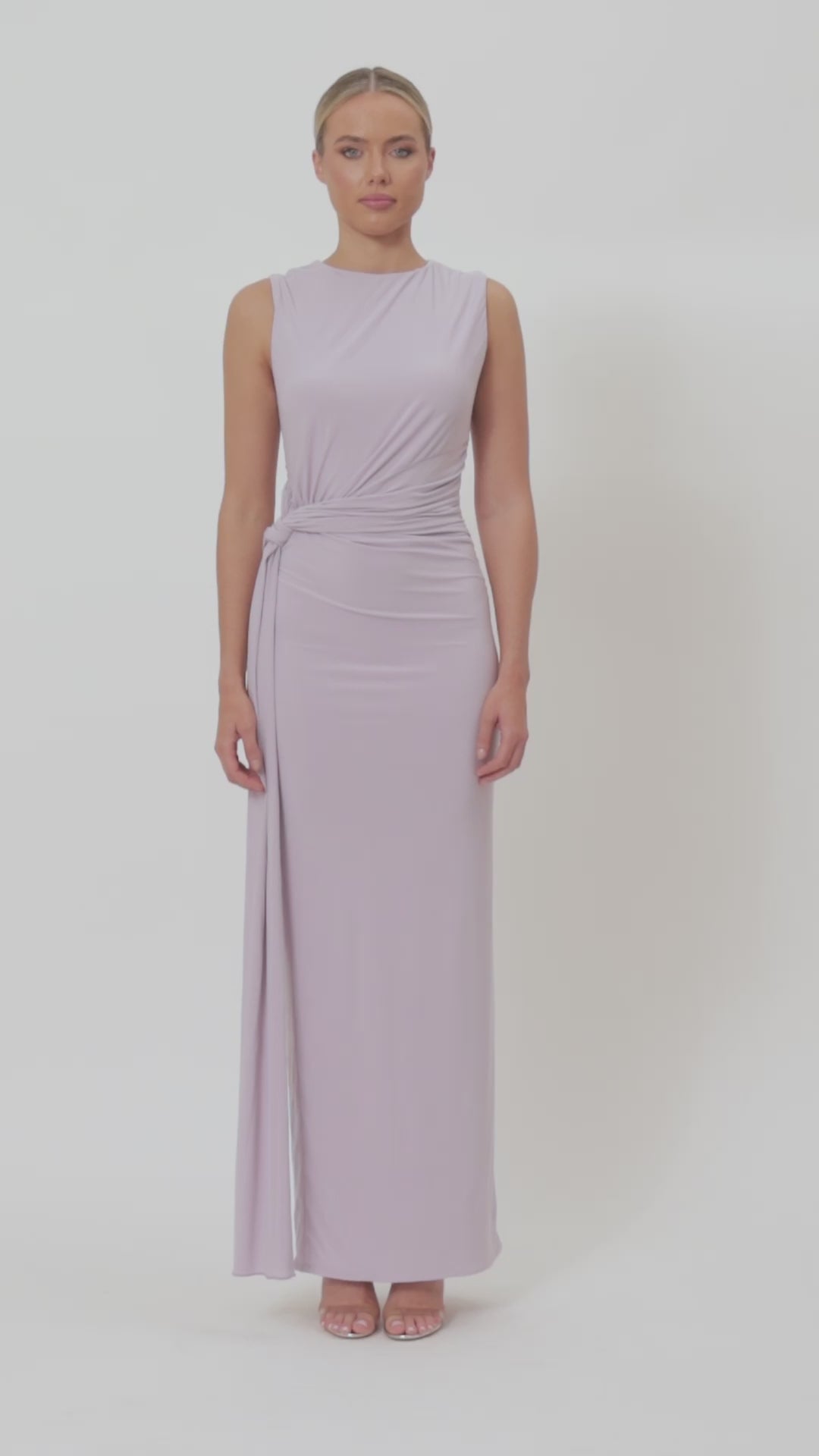 Introducing the Lilac Midi Dress, a soft, feminine silhouette designed to flatter. Featuring a knot tie at the right waist that falls into extended draping that flows effortlessly down the right side, creating graceful movement with every step.