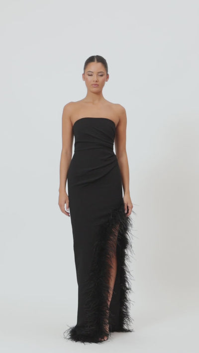 Introducing the Lilibeth Maxi Dress. A show-stopping blend of elegance this strapless maxi dress is designed to make an impact, featuring a high front-side split adorned with luxurious feather trim along the split line and hem. The beautifully ruched waist creates a flattering silhouette, accentuating your curves with effortless sophistication.