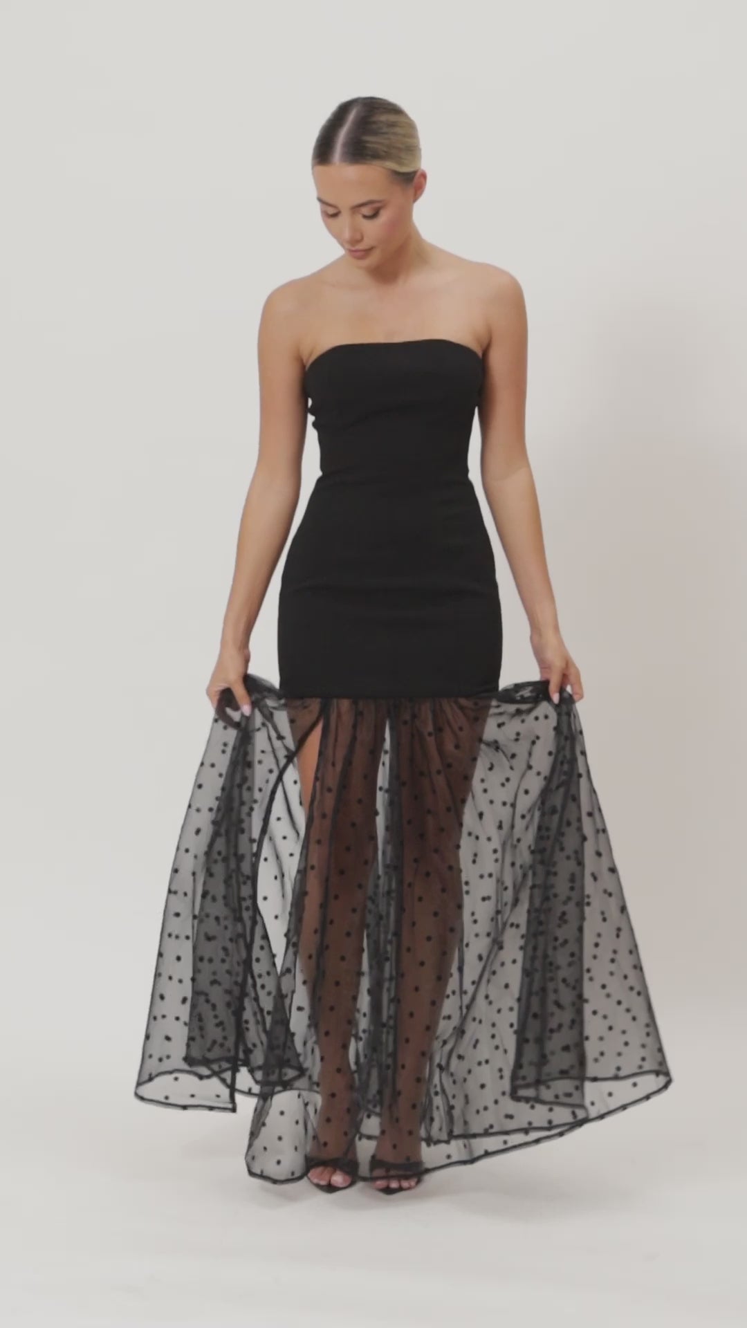 Introducing the Londyn Maxi Dress, featuring a strapless bodice paired with a contrasting sheer organza polka dot skirt. The skirt’s delicate texture and side split add movement and allure, while the centre back zip ensures a flawless fit. Perfect for making a statement with playful elegance.
