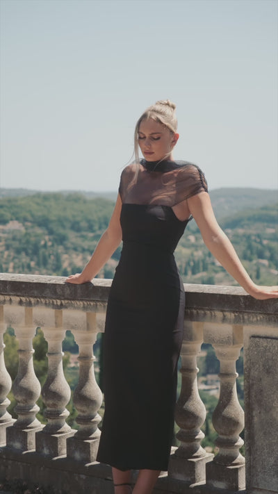 Introducing the Marlee Midi Dress. Featuring a straight, strapless bodice elegantly paired with a sheer tulle shoulder covering. A centre back hem split and discreet centre back zip complete the silhouette, combining modern sophistication with subtle drama.
