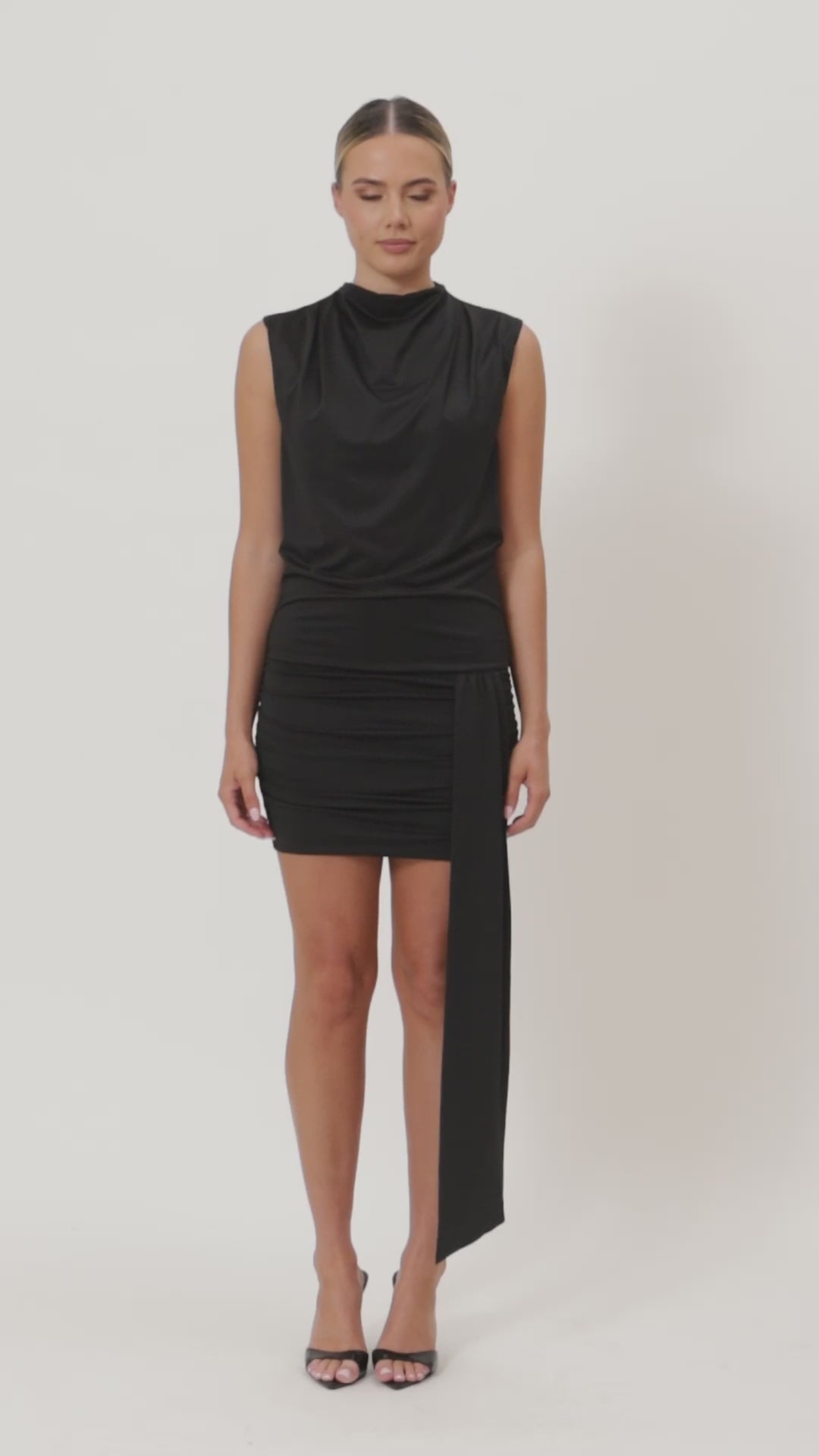 Introducing the Salome Mini Dress. A stylish mini dress crafted in soft jersey, featuring exaggerated draping at the front left side and subtle ruching around the lower waist and hips for a flattering, sculpted silhouette. Finished with a centre back zip for a seamless fit.
